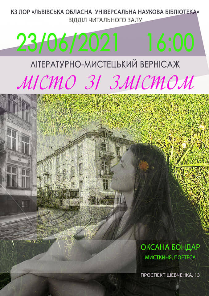 23 червня 2021 року у приміщенні #Львівська_обласна_універсальна_наукова_бібліотека на проспекті Шевченка, 13 у партнерстві з відділом абонента #КлубБук-абонемент відбулося відкриття авторського мистецького проєкту методистки з естетичного виховання і народних традицій #КЗ_ЛОР_Львівський_обласний_центр_народної_творчості_і_культурно-освітньої_роботи Оксани Бондар Літературно-мистецький вернісаж #МІСТО_ЗІ_ЗМІСТОМ у якому органічно поєдналися світлини та поезія авторки. Незвичною та цікавою була також подача фоторобіт, котрі мисткиня вплела у панно за допомогою техніки макраме.